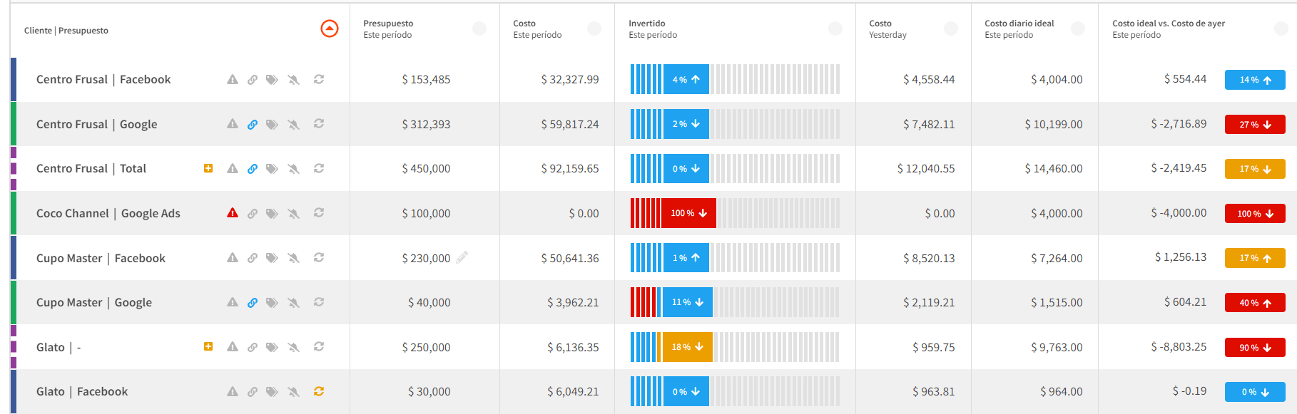 Con un simple vistazo a nuestro intuitivo panel de control, podrás evaluar rápidamente si es necesario modificar los presupuestos dentro de cada plataforma publicitaria. Dashbo te ofrece una visión global de todas las cuentas, brindándote el control total sobre tus inversiones.