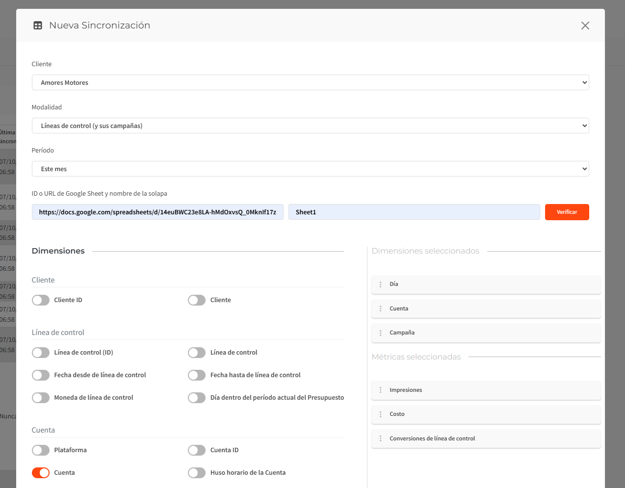 Es muy fácil configurar qué información quieres exportar a planillas de Google Sheet. Sólo tienes que seleccionar el cliente, las dimensiones, métricas y el período.